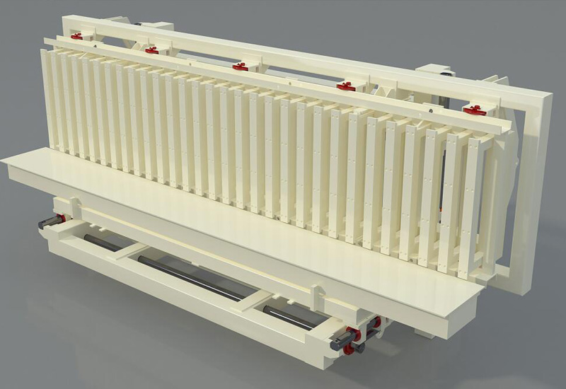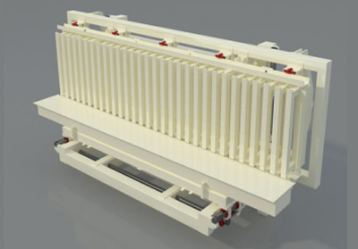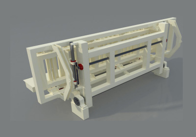 坯體切割底面會有一些廢料。翻轉臺將坯體在翻轉架上轉過90°后,坯體底面切割的表皮由水平位置轉變成垂直位置,在重力作用下,自動脫落,坯體表面廢料被去除。翻轉臺全部采用液壓驅動。翻轉油缸還具有終點緩沖性能。為了保證蒸養底板、側板在翻轉過程中的穩固性,在它們處于翻轉位置時側面都設有鎖緊機構。