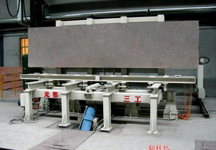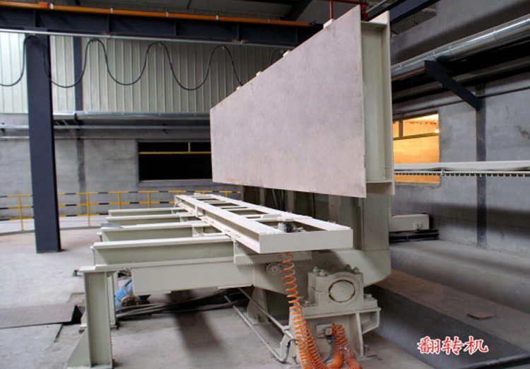 加氣磚成套生產線中用到的一種翻轉設備,翻轉臺,主要是加氣線里面,切割完成后,坯體經由翻轉臺90度翻轉,再刮廢料機刮除坯體頂部和底部的廢料。