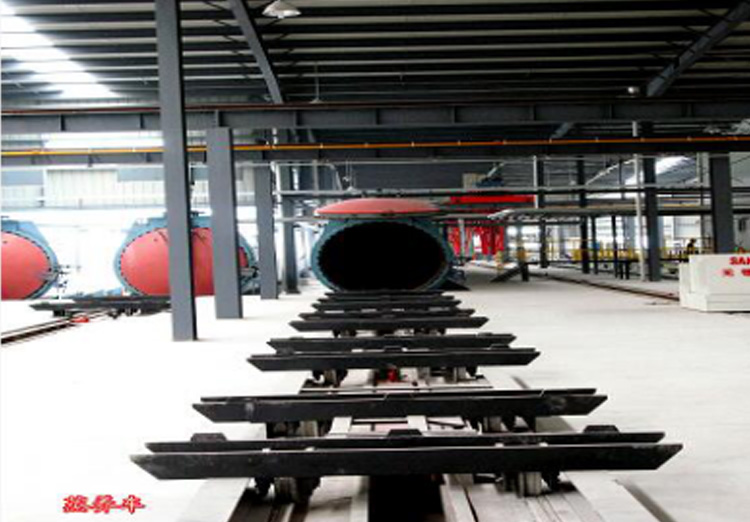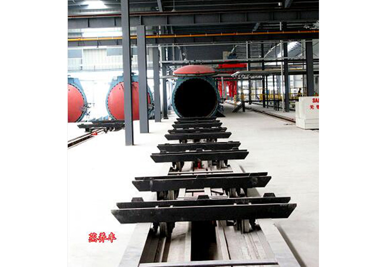 蒸養(yǎng)小車是生產(chǎn)過程中的專用運(yùn)輸車輛,其裝載著切割后的坯體,進(jìn)入蒸壓釜護(hù)養(yǎng)。護(hù)養(yǎng)后,將成品運(yùn)送至成品場(chǎng)地,成品被吊卸后,蒸養(yǎng)車再次載坯體入釜護(hù)養(yǎng)。